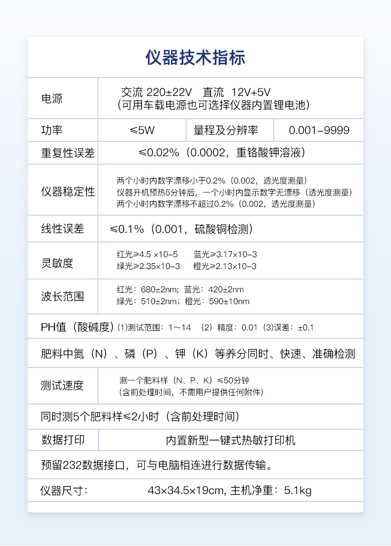 | 電源:交流 220±22V 直流 12V+5V(可用車載電源也可選擇儀器內(nèi)置鋰電池) | 功率: ≤5W | 量程及分辨率:0.001-9999 | 重復(fù)性誤差: ≤0.02%(0.0002,重鉻酸鉀溶液) | 儀器穩(wěn)定性:兩個(gè)小時(shí)內(nèi)數(shù)字漂移小于0.2%(0.002,透光度測量)。儀器開機(jī)預(yù)熱5分鐘后,一個(gè)小時(shí)內(nèi)顯示數(shù)字無漂移(透光度測量),兩個(gè)小時(shí)內(nèi)數(shù)字漂移不超過0.2%(0.002,透光度測量)。 | 線性誤差: ≤0.1%(0.001,硫酸銅檢測) | 靈敏度:紅光≥4.5 ×10-5 藍(lán)光≥3.17×10-3 綠光≥2.35×10-3 橙光≥2.13×10-3 | 波長范圍 :紅光:680±2nm; 藍(lán)光:420±2nm;綠光:510±2nm;橙光:590±10nm | PH值(酸堿度): (1)測試范圍:1~14 (2)精度:0.01 (3)誤差:±0.1 | 肥料中氮(N)、磷(P)、鉀(K)等養(yǎng)分同時(shí)、快速、準(zhǔn)確檢測 | 測試速度:測一個(gè)肥料樣(N、P、K)≤50分鐘(含前處理時(shí)間,不需用戶提供任何附件) | 同時(shí)測5個(gè)肥料樣≤2小時(shí)(含前處理時(shí)間) | 數(shù)據(jù)打?。簝?nèi)置新型一鍵式熱敏打印機(jī) | 預(yù)留232數(shù)據(jù)接口,可與電腦相連進(jìn)行數(shù)據(jù)傳輸。 | 儀器尺寸:43×34.5×19cm, 主機(jī)凈重:5.1kg |