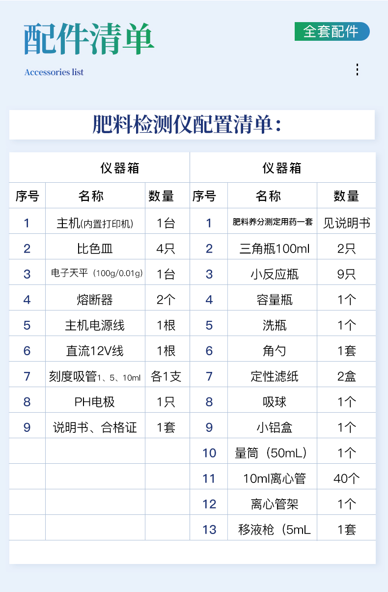 | 名稱 | 肥料養(yǎng)分測定用藥一套 | 三角瓶100ml | 小反應(yīng)瓶 | 容量瓶 | 洗瓶 | 角勺 | 定性濾紙 | 吸球 | 小鋁盒 | 量筒(50mL) | 10ml離心管 | 離心管架 | 移液槍(5mL) |