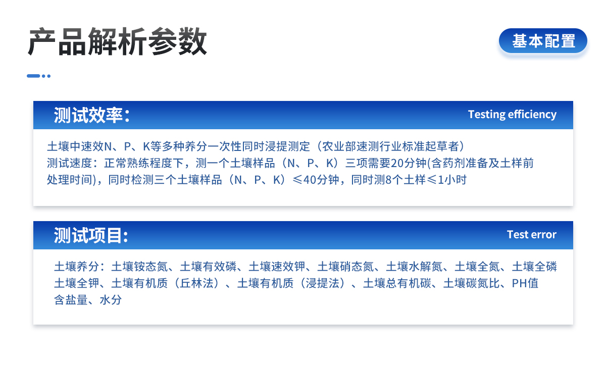 | 土壤中速效N、P、K等多種養(yǎng)分一次性同時(shí)浸提測(cè)定(農(nóng)業(yè)部速測(cè)行業(yè)標(biāo)準(zhǔn)起草者)。 | 測(cè)試速度:正常熟練程度下,測(cè)一個(gè)土壤樣品(N、P、K)三項(xiàng)需要20分鐘(含藥劑準(zhǔn)備及土樣前處理時(shí)間),同時(shí)檢測(cè)三個(gè)土壤樣品(N、P、K)≤40分鐘,同時(shí)測(cè)8個(gè)土樣≤1小時(shí)。 |