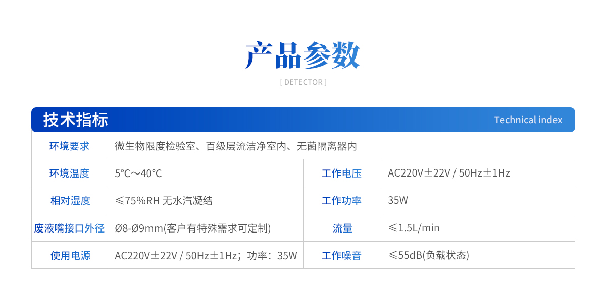 | ① 環(huán)境要求:微生物限度檢驗(yàn)室、百級(jí)層流潔凈室內(nèi)、無(wú)菌隔離器內(nèi) ② 環(huán)境溫度:5℃~40℃ ③ 相對(duì)濕度:≤75%RH 無(wú)水汽凝結(jié) ④ 廢液嘴接口外徑:?8-?9mm(客戶有特殊需求可定制) ⑤ 使用電源:AC220V±22V / 50Hz±1Hz;功率:35W |