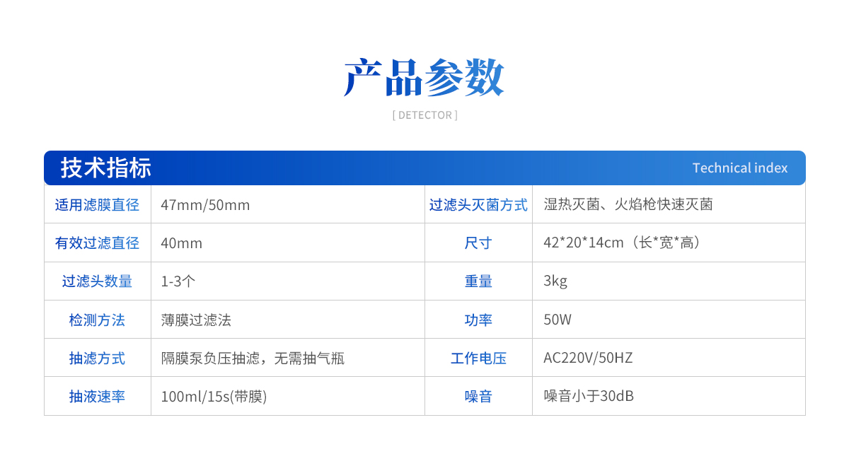 | 1、適用濾膜直徑:47mm/50mm 2、有效過濾直徑:40mm 3、過濾頭數(shù)量:1-3個 4、檢測方法:薄膜過濾法 5、抽濾方式:隔膜泵負壓抽濾,無需抽氣瓶 6、抽液速率:100ml/15s(帶膜) 7、過濾頭滅菌方式:濕熱滅菌、火焰槍快速滅菌 8、尺寸:42*20*14cm(長*寬*高) 9、重量:3kg 10、功率:50W 11、工作電壓:AC220V/50HZ 12、噪音小于30dB 13、物理按鈕開關(guān) 14、可選擇三頭、六頭結(jié)構(gòu),選型豐富 |