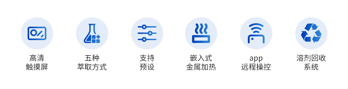 | ?全部有機溶劑均可使用,包括苯類、微類、酮類 等,滿足各種有機溶劑的使用條件 | ?采用全自動標(biāo)準(zhǔn)索氏萃取,全通道為玻璃與四氟材質(zhì),有效避免雜質(zhì)的引入,準(zhǔn)確性高 | ?可以app遠程操作控制,實現(xiàn)遠程通訊功能,方便客戶實時查看實驗允許情況 | ?采用一鍵開始與暫停操作,實驗過程掌控靈活 | ?外置壁掛型控制器,方便靈活,簡單快捷 | ?采用七寸大液晶觸摸屏控制,顯示屏具有折疊功能,不用時可以收起不占用空間 | ?五種萃取方式,滿足不同客戶萃取需求 | ?預(yù)設(shè)常用試劑選項,高頻次實驗一鍵輕松搞定 | ?整體嵌入式金屬加熱,升溫更快,效率更高 | ?進出水路溫度監(jiān)控與流量控制,配合冷凝水有無實時監(jiān)測,保證有機蒸氣冷凝回流無泄漏的效果下,節(jié)約水資源 | ?具有高-效的溶劑回收系統(tǒng),有效減少試劑的浪費 |