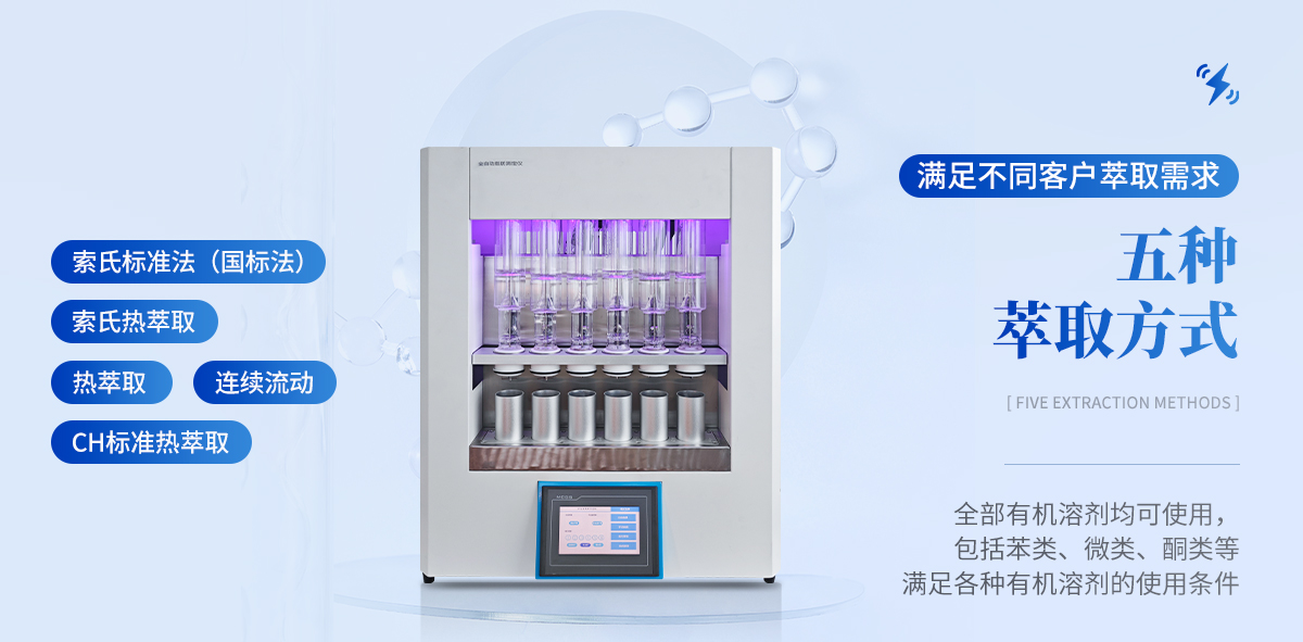 全自動脂肪測定儀(索氏提取儀)是根據(jù)索氏抽提原理,對脂肪等有機物進行萃取分離的儀器。儀器具有索氏標(biāo)準(zhǔn)法(國標(biāo)法)、索氏熱萃取、熱萃取、連續(xù)流動及CH標(biāo)準(zhǔn)熱萃取等五種萃取方式;采用整體嵌入式金屬加熱,升溫快, 效果好,功耗低。安卓風(fēng)格界面設(shè)計,豎屏外置壁掛式控制器,使操作更加簡便快捷;進出水路全方位溫度監(jiān)控與流量控 制,更加環(huán)保與節(jié)約;內(nèi)置乙謎泄漏檢測 裝置有效防止空氣污染,充分保障了實驗的安全性。