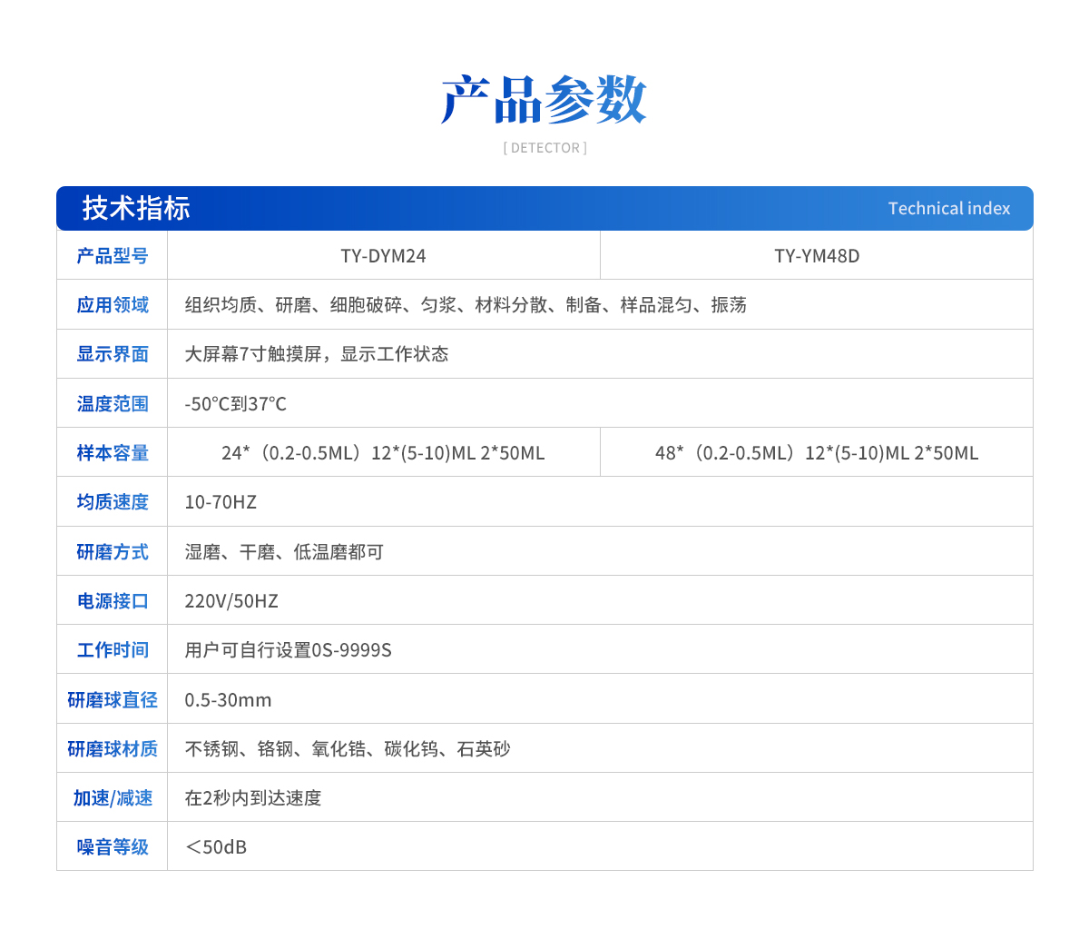 | 應用領域:組織均質、研磨、細胞破碎、勻漿、材料分散、制備、樣品混勻、振蕩 液晶顯示:大屏幕7寸觸摸屏,顯示工作狀態(tài) 溫度范圍:-50℃到37℃ 處理樣本量:24*(0.2-0.5ML)12*(5-10)ML 2*50ML 均質速度:10-70HZ 電源:兩相220V /50HZ 工作時間:0秒-9999s,用戶可自行設定 研磨球直徑:0.5-30mm 研磨球材料:不銹鋼、鉻鋼、氧化鋯、碳化鎢、石英砂 加速:在2秒內(nèi)達到最大速度 減速:在2秒內(nèi)達到**速度 噪音等級:小于50db |