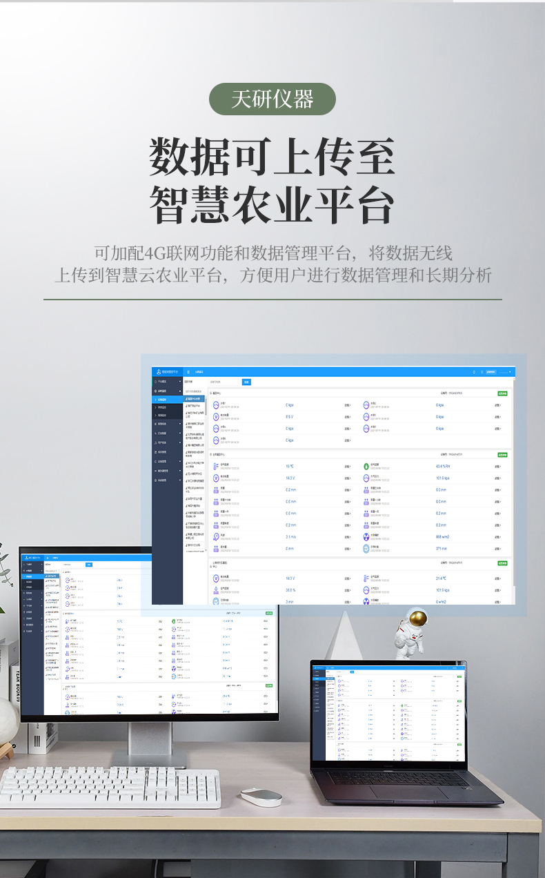 | 儀器可加配4G聯(lián)網(wǎng)功和能數(shù)據(jù)管理平臺(tái),將本機(jī)存儲(chǔ)的被測(cè)點(diǎn)環(huán)境因子測(cè)量歷史數(shù)據(jù)無(wú)線(xiàn)上傳到智慧云農(nóng)業(yè)平臺(tái),方便用戶(hù)進(jìn)行數(shù)據(jù)管理和長(zhǎng)期分析。 | 本機(jī)體積小巧、美觀,操作簡(jiǎn)單方便,性能可靠,野外攜帶極為方便。主機(jī)連接傳感器后可以手動(dòng)存儲(chǔ)記錄也可通過(guò)主機(jī)任意設(shè)置采樣間隔,自動(dòng)存儲(chǔ)記錄數(shù)據(jù)。 | 大屏幕彩色液晶顯示屏,全程跟蹤記錄各個(gè)被測(cè)環(huán)境因子的數(shù)值、組數(shù)、低電壓示警,主機(jī)內(nèi)置大容量存儲(chǔ)器,可儲(chǔ)存三十萬(wàn)條數(shù)據(jù),具有斷電數(shù)據(jù)自動(dòng)存儲(chǔ)保護(hù)功能。 | 各個(gè)傳感器插入主機(jī)后,主機(jī)具有自動(dòng)識(shí)別功能,傳感器一致性好,可按需求自行組合傳感器,不同參數(shù)的傳感器接口可以互相轉(zhuǎn)換,對(duì)測(cè)量精度沒(méi)有影響。 | 儀器具有多通道自動(dòng)檢測(cè)擴(kuò)展功能,可以實(shí)現(xiàn)多個(gè)傳感器同時(shí)接入的同步檢測(cè)。 | 上位機(jī)軟件功能強(qiáng)大,隨時(shí)可以通過(guò)USB接口將記錄中的數(shù)據(jù)導(dǎo)出到計(jì)算機(jī)上,并可以存儲(chǔ)為EXCE表格文件,生成數(shù)據(jù)曲線(xiàn),以供其它分析軟件進(jìn)一步進(jìn)行數(shù)據(jù)處理。具有設(shè)置超限區(qū)域著色功能,超限數(shù)據(jù)變色預(yù)警,可作為環(huán)境評(píng)價(jià)的一個(gè)依據(jù)。 |