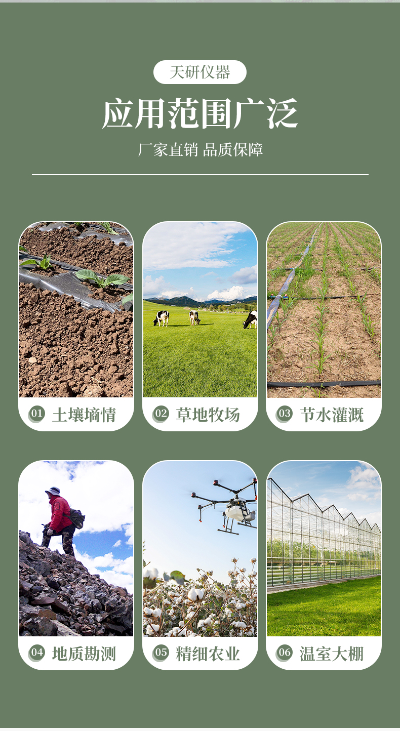 土壤水分溫度鹽分測定儀傳感器采用一體化結(jié)構(gòu)設(shè)計,可快速準(zhǔn)確測量土壤中含水量、溫度和電導(dǎo)率(鹽分),可對多處樣地、不同土壤深度的水分含量溫度和鹽分進(jìn)行快速檢測和長期連續(xù)監(jiān)測。廣泛應(yīng)用于土壤墑情檢測、旱作節(jié)水灌溉、精細(xì)農(nóng)業(yè)、林業(yè)、地質(zhì)勘探、植物培育、水利、環(huán)保等領(lǐng)域。