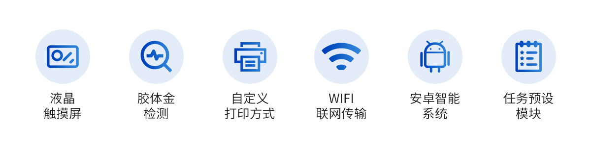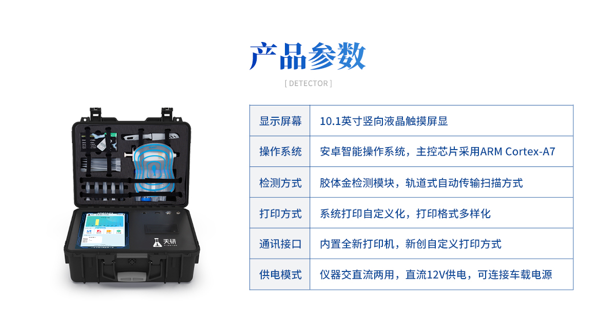 | 核心功能模塊:膠體金檢測模塊、數(shù)字化管理模塊、無線通訊模塊 | 供電方式:交直流兩用,可連接車載電源 |