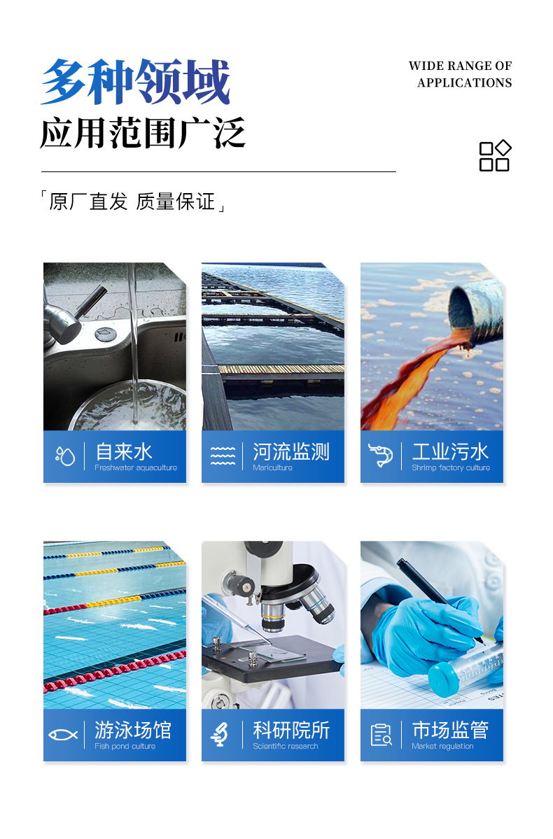 適用于 游泳場(chǎng)館、飲用水、自來(lái)水、醫(yī)療廢水、工業(yè)污、河流監(jiān)測(cè)、水源保護(hù)、生產(chǎn)監(jiān)測(cè)、科研實(shí)驗(yàn)等。