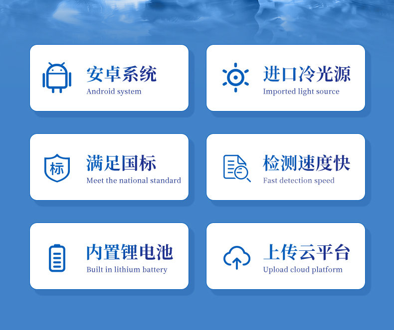 | 1、安卓智能系統(tǒng),操作更佳簡(jiǎn)便快捷; | 2、配置云監(jiān)控平臺(tái),檢測(cè)結(jié)果可直接無(wú)線傳至平臺(tái),進(jìn)行水質(zhì)長(zhǎng)短期分析,輔助管理。 | 3、內(nèi)置操作流程、操作簡(jiǎn)單、無(wú)需培訓(xùn)、直接上手; | 4、檢測(cè)速度更快,現(xiàn)場(chǎng)讀取數(shù)據(jù); | 5、便攜式體積小,重量輕,方便戶(hù)外檢測(cè); | 6、外形小巧美觀,工作穩(wěn)定免維護(hù),具有較好的性?xún)r(jià)比; | 7、采用進(jìn)口冷光源,光學(xué)性能穩(wěn)定,壽命長(zhǎng)達(dá)10萬(wàn)小時(shí); | 8、交直流兩用,內(nèi)置充電鋰電池,環(huán)保耐用可支持連續(xù)室內(nèi)外工作。 |