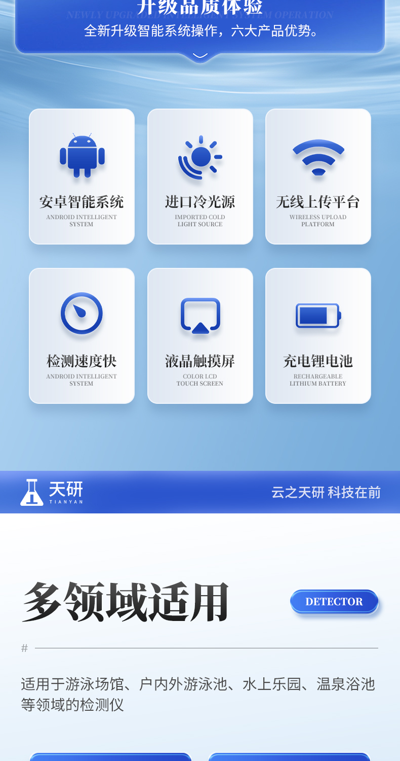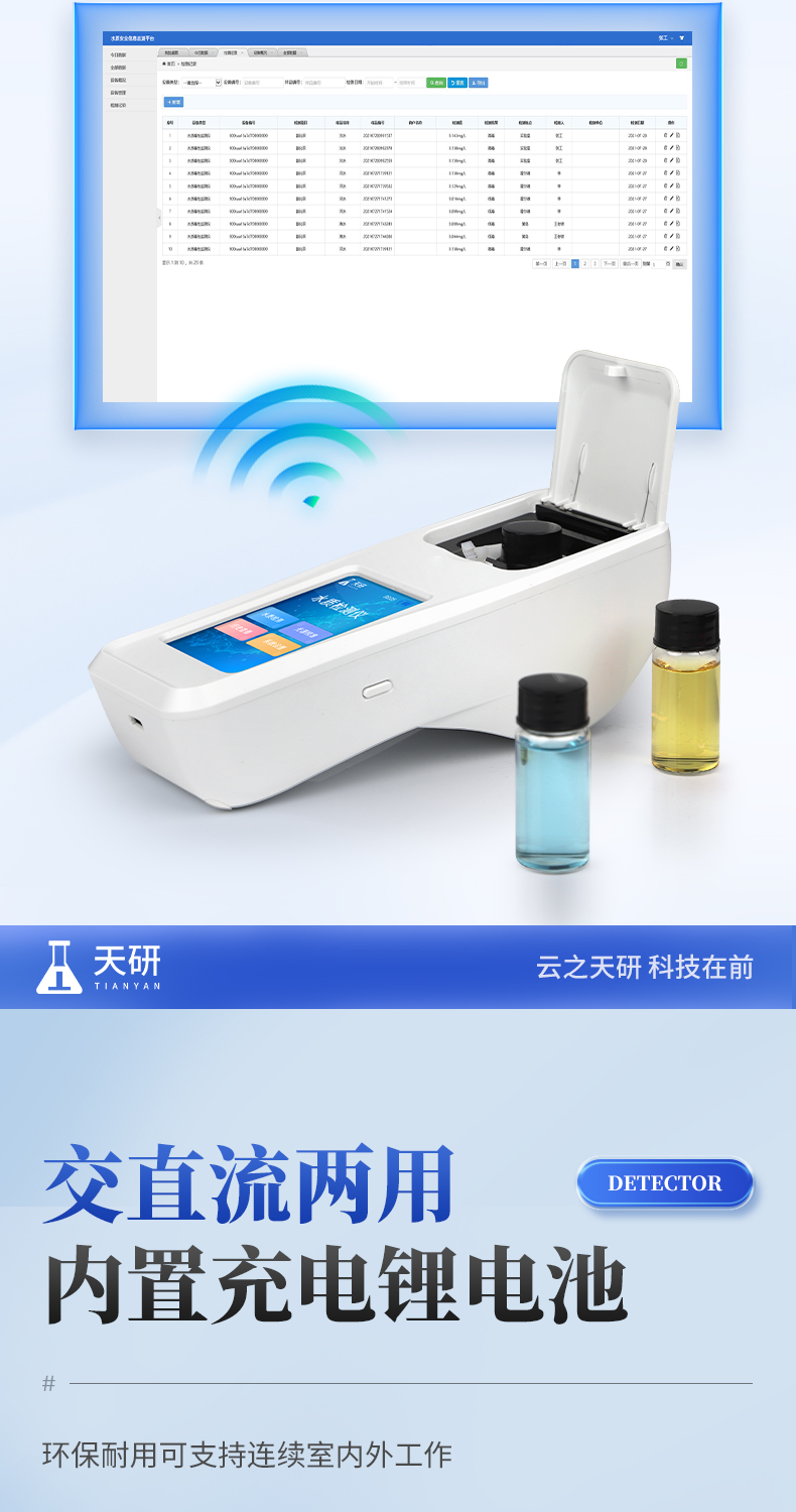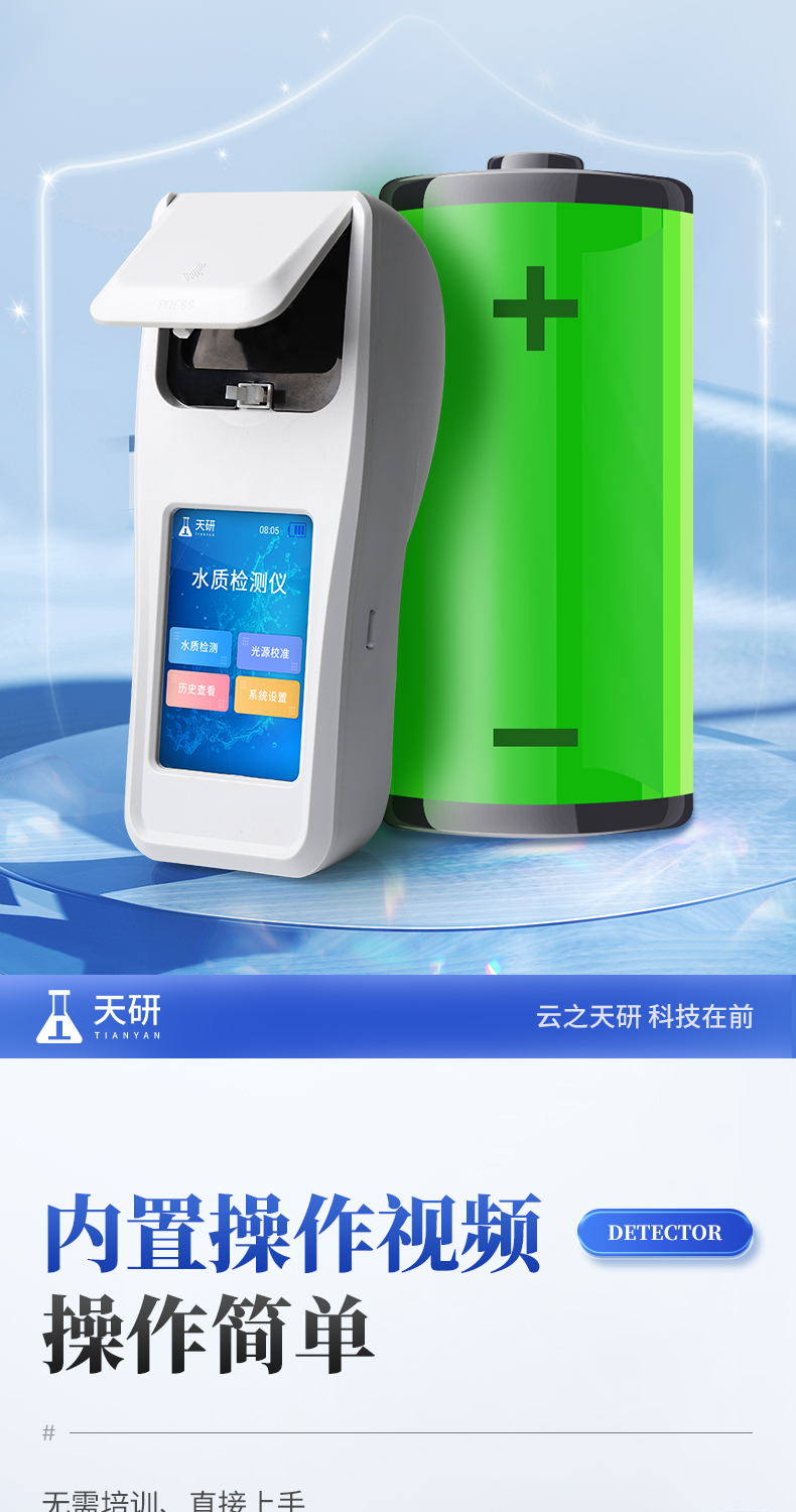 | 1、安卓智能系統(tǒng),操作更佳簡便快捷; | 2、配置云監(jiān)控平臺,檢測結(jié)果可直接無線傳至平臺,進(jìn)行水質(zhì)長短期分析,輔助管理; | 3、內(nèi)置操作流程、操作簡單、無需培訓(xùn)、直接上手; | 4、檢測速度更快,現(xiàn)場讀取數(shù)據(jù); | 5、便攜式體積小,重量輕,方便戶外檢測; | 6、外形小巧美觀,工作穩(wěn)定免維護(hù),具有較好的性價比; | 7、采用進(jìn)口冷光源,光學(xué)性能穩(wěn)定,壽命長達(dá)10萬小時; | 8、交直流兩用,內(nèi)置充電鋰電池,環(huán)保耐用可支持連續(xù)室內(nèi)外工作。 |