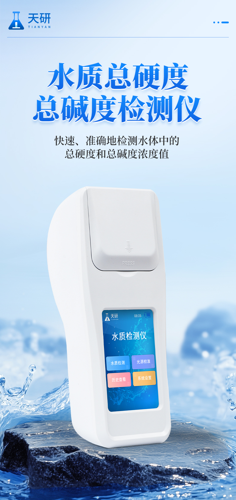水質(zhì)總硬度總堿度檢測儀可簡單快速測試水質(zhì)中總硬度、總堿度濃度值。利用比色法原理配合總硬度、總堿度檢測試劑快速準(zhǔn)確測試水中總硬度總堿度含量。