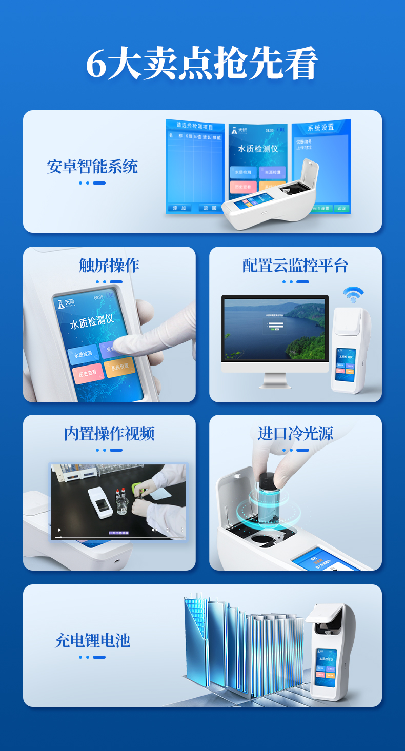 | 1、安卓智能系統(tǒng),操作更佳簡便快捷; | 2、配置云監(jiān)控平臺,檢測結(jié)果可直接無線傳至平臺,進(jìn)行水質(zhì)長短期分析,輔助管理; | 3、內(nèi)置操作流程、操作簡單、無需培訓(xùn)、直接上手; | 4、檢測速度更快,現(xiàn)場讀取數(shù)據(jù); | 5、便攜式體積小,重量輕,方便戶外檢測; | 6、外形小巧美觀,工作穩(wěn)定免維護(hù),具有較好的性價比; | 7、采用進(jìn)口冷光源,光學(xué)性能穩(wěn)定,壽命長達(dá)10萬小時; | 8、交直流兩用,內(nèi)置充電鋰電池,環(huán)保耐用可支持連續(xù)室內(nèi)外工作。 |