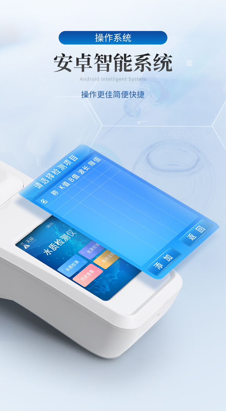 | 1、安卓智能系統(tǒng),操作更佳簡(jiǎn)便快捷; | 2、配置云監(jiān)控平臺(tái),檢測(cè)結(jié)果可直接無線傳至平臺(tái),進(jìn)行水質(zhì)長(zhǎng)短期分析,輔助管理; | 3、內(nèi)置操作流程、操作簡(jiǎn)單、無需培訓(xùn)、直接上手; | 4、檢測(cè)速度更快,現(xiàn)場(chǎng)讀取數(shù)據(jù); | 5、便攜式體積小,重量輕,方便戶外檢測(cè); | 6、外形小巧美觀,工作穩(wěn)定免維護(hù),具有較好的性價(jià)比; | 7、采用進(jìn)口冷光源,光學(xué)性能穩(wěn)定,壽命長(zhǎng)達(dá)10萬小時(shí); | 8、交直流兩用,內(nèi)置充電鋰電池,環(huán)保耐用可支持連續(xù)室內(nèi)外工作。 |