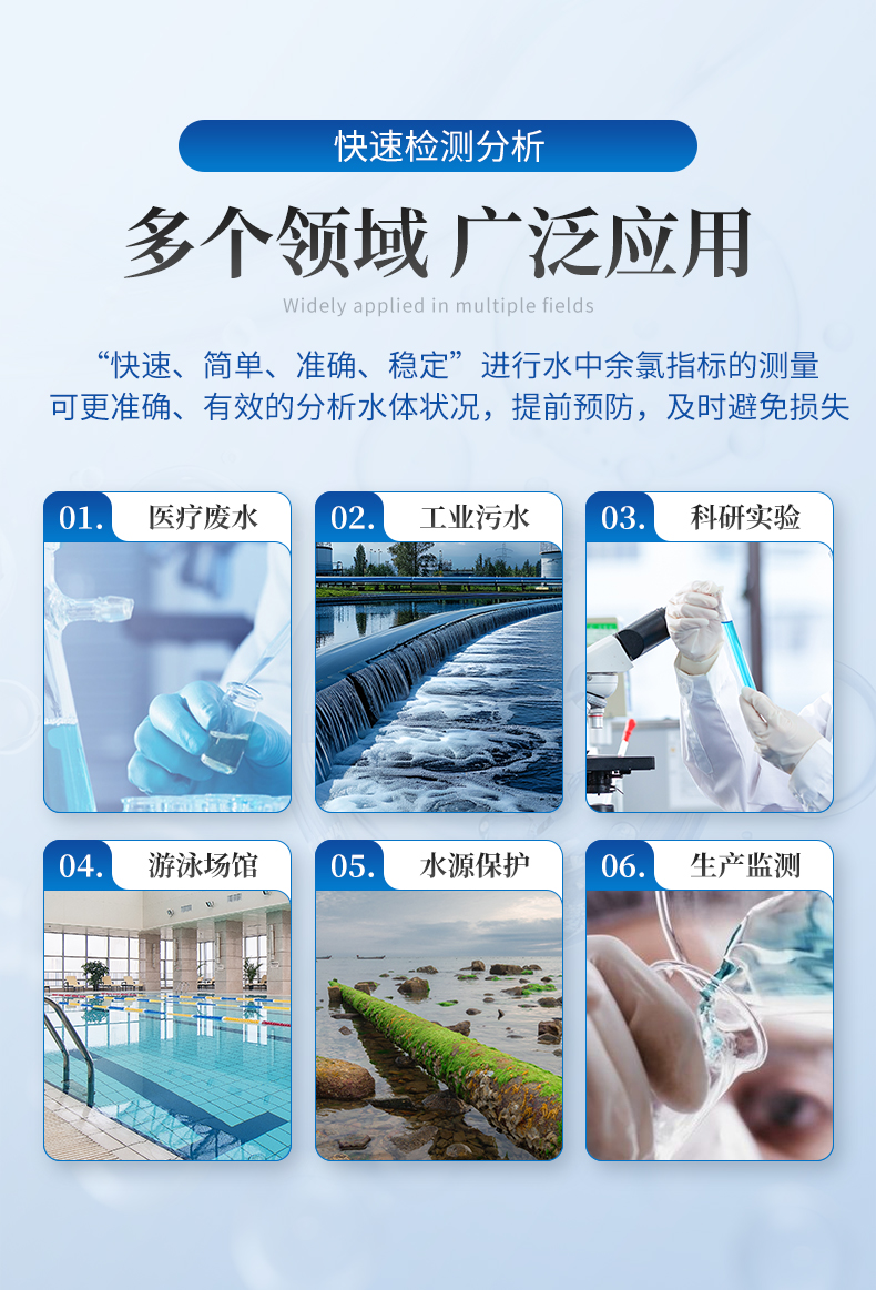適用于純凈水廠、自來水廠、生活污水處理廠、醫(yī)療廢水、工業(yè)污水、游泳場(chǎng)館、水產(chǎn)養(yǎng)殖、河流監(jiān)測(cè)、水源保護(hù)、生產(chǎn)監(jiān)測(cè)、科研實(shí)驗(yàn)等。