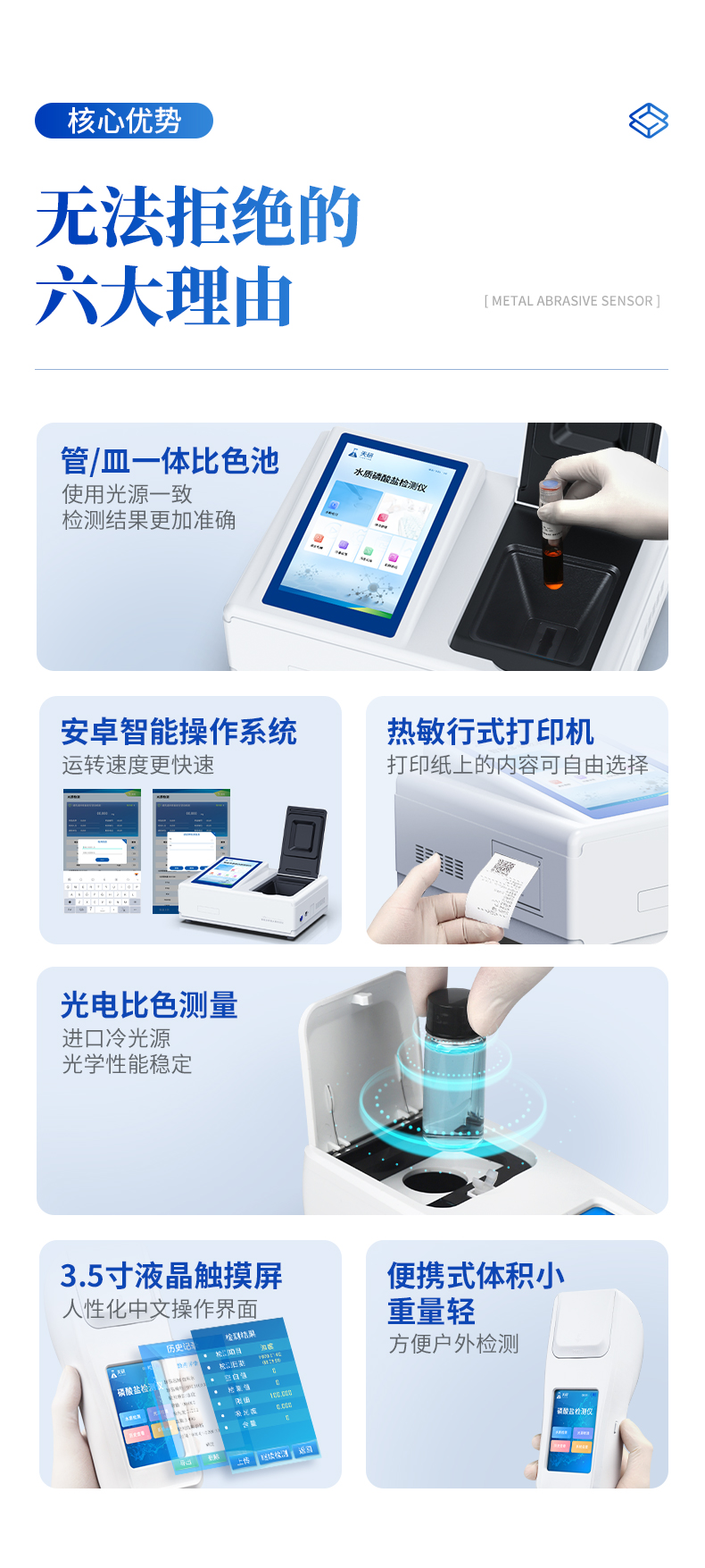 | 1、快速檢測水體中磷酸鹽指標(biāo) | 2、安卓智能系統(tǒng)操作更佳簡便快捷 | 3、內(nèi)置操作流程、操作簡單、無需培訓(xùn)、直接上手 | 4、檢測速度快,現(xiàn)場讀取數(shù)據(jù) | 5、便攜式體積小,重量輕,方便戶外檢測 | 6、外形小巧美觀,工作穩(wěn)定免維護(hù),具有較好的性價比 | 7、采用進(jìn)口冷光源,光學(xué)性能穩(wěn)定,壽命長達(dá)10萬小時 |