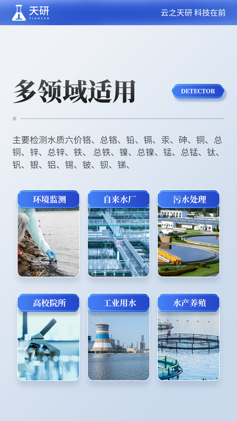 多參數(shù)水質(zhì)重金屬檢測儀是完全參考國家標(biāo)準(zhǔn)、環(huán)境標(biāo)準(zhǔn)等相關(guān)標(biāo)準(zhǔn)設(shè)計制造,適用于國內(nèi)外眾多檢測標(biāo)準(zhǔn)。 主要檢測水質(zhì)六價鉻、總鉻、鉛、鎘、汞、砷、銅、總銅、鋅、總鋅、鐵、總鐵、鎳、總鎳、錳、總錳、鈦、釩、銀、鋁、錫、鈹、鋇、銻、鈷等重金屬含量指標(biāo);本儀器兼具智能數(shù)據(jù)分析功能,圖表、列表顯示數(shù)據(jù),分析一目了然;高清晰度彩色液晶觸摸顯示屏,Android智能操作系統(tǒng),中文顯示界面,中英文鍵盤,人性化操作,使用更簡單。