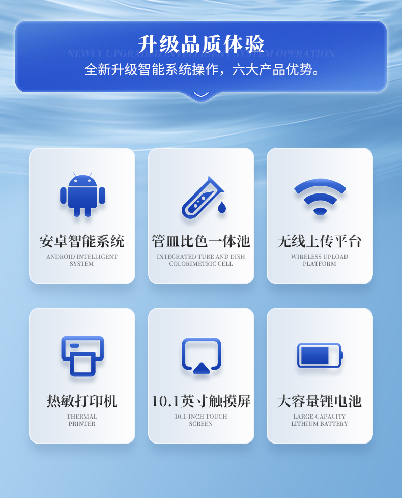 | 1、采用全新安卓7.1.1智能操作系統(tǒng),人性化中文操作界面,運轉(zhuǎn)速度更快速,穩(wěn)定性更強。 | 2、10.1英寸液晶觸摸屏顯示,人性化中文操作界面,讀數(shù)直觀、簡單。 | 3、采用精密比色池設(shè)計,使用光源一致,可以解決由于光源誤差帶來的檢測結(jié)果誤差問題,檢測結(jié)果更加精準(zhǔn)。 | 4、光源采用進(jìn)口超高亮發(fā)光二極管,光源亮度可以自動調(diào)節(jié)與校準(zhǔn)。 | 5、支持10mm、30mm、50mm皿比色和φ16mm管比色等比色方式,多元選擇,確保測量的準(zhǔn)確性; | 6、具有無線通訊功能,支持WIFI、RJ45、手機熱點聯(lián)網(wǎng)傳輸,檢測數(shù)據(jù)亦可通過U盤導(dǎo)出; | 7、多功能樣品管理,可對樣品進(jìn)行中英文命名,方便樣品記錄和數(shù)據(jù)存儲; | 8、儀器可永久存儲800萬組數(shù)據(jù),為方便大量數(shù)據(jù)查找,可通過時間檢索,并隨意選擇分析; | 9、儀器帶有監(jiān)管云平臺,數(shù)據(jù)可通過局域網(wǎng)和互聯(lián)網(wǎng)上傳,亦可對接上傳至環(huán)境監(jiān)管部門平臺。 | 10、內(nèi)置熱敏行式打印機,打印紙上的內(nèi)容可自由選擇(包括二維碼打印); | 11、交流220V,可選配6ah大容量充電鋰電池,方便戶外流動測試; | 12、后期產(chǎn)品固件可升級。 |