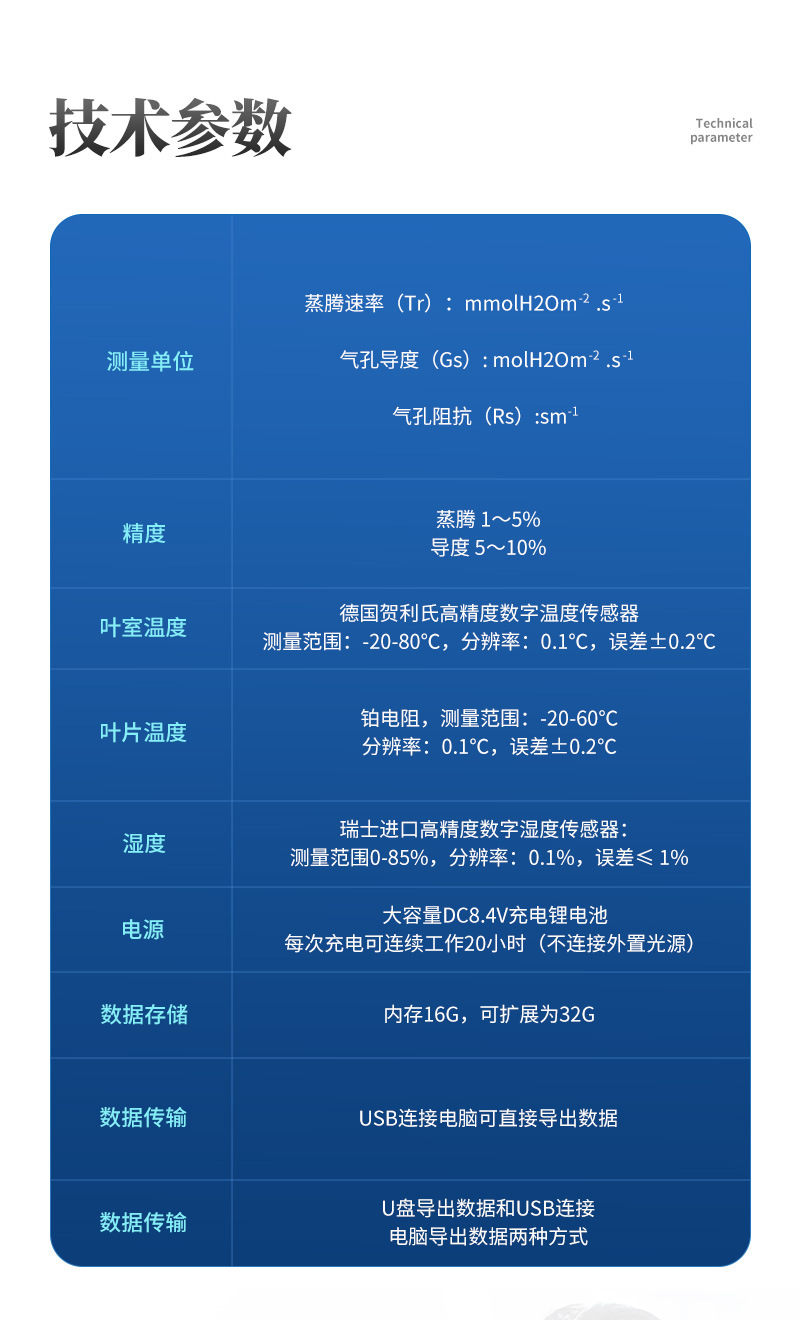 | 空氣溫度:瑞士進(jìn)口高精度數(shù)字溫度傳感器,測量范圍:0-50℃,分辨率:0.1℃,誤差±0.2℃ | 葉片溫度:鉑電阻,測量范圍:0-50℃,分辨率:0.1℃,誤差±0.2℃ |