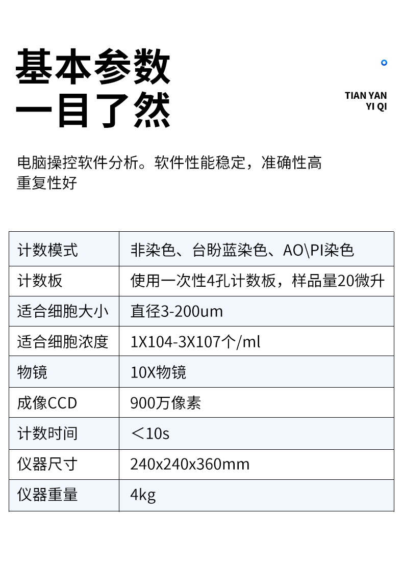 細(xì)胞計(jì)數(shù)儀簡(jiǎn)述: 該細(xì)胞計(jì)數(shù)儀采用自主研發(fā)的細(xì)胞成像技術(shù)結(jié)合傳統(tǒng)血球計(jì)數(shù)原理,通過(guò)計(jì)數(shù)軟件實(shí)現(xiàn)細(xì)胞圖像自動(dòng)計(jì)數(shù)、活力分析,并繪制細(xì)胞大小柱狀圖;儀器可直接放置在細(xì)胞培養(yǎng)室及超凈工作臺(tái)中,支持電腦操控軟件分析,軟件性能穩(wěn)定、準(zhǔn)確性高、重復(fù)性好。 基本參數(shù):