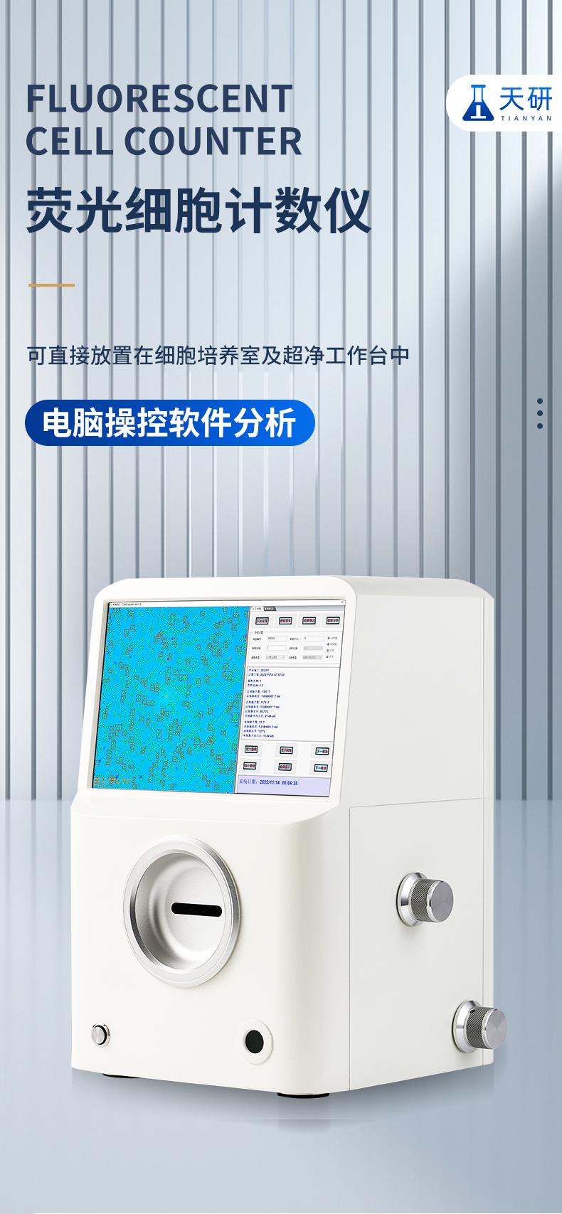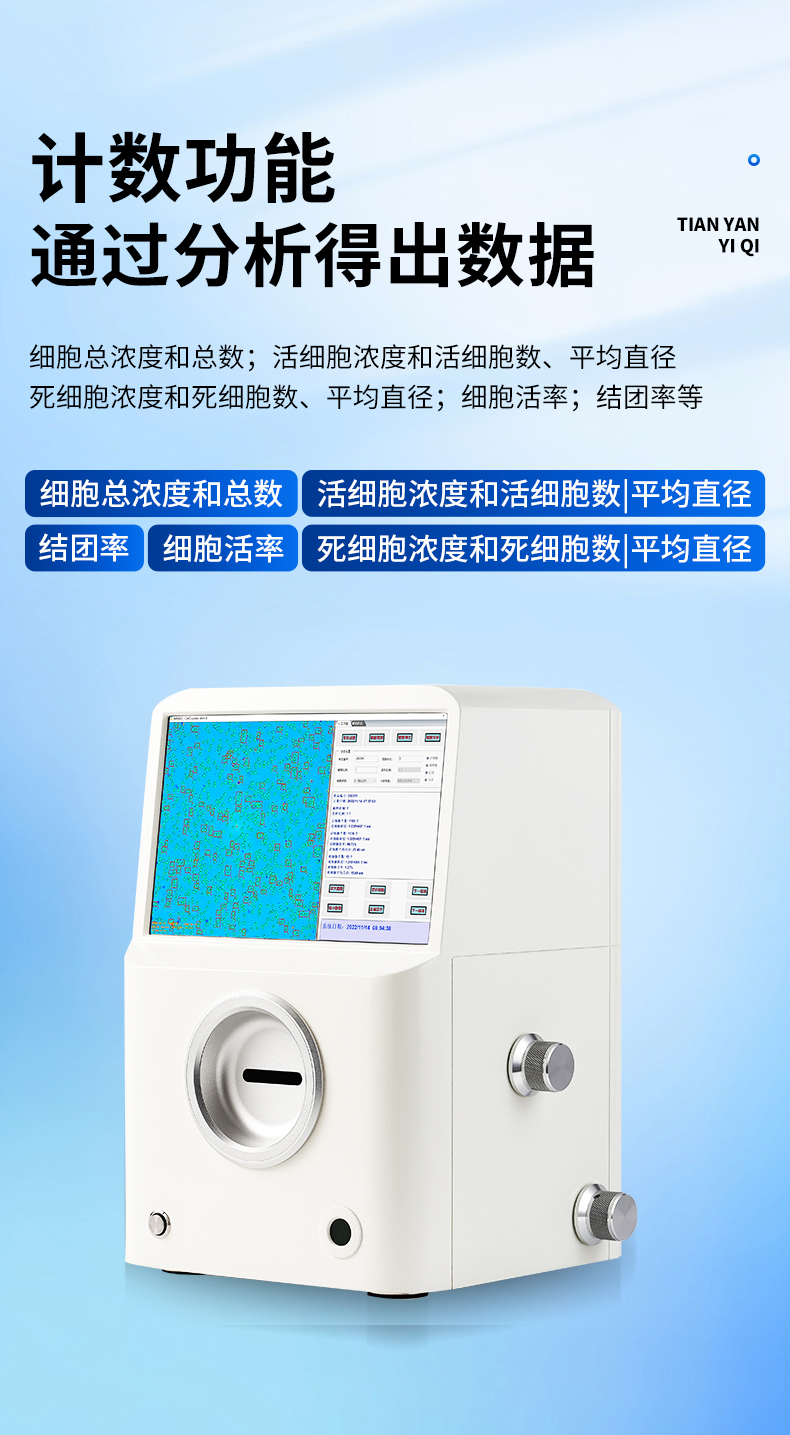 該細(xì)胞計(jì)數(shù)儀采用自主研發(fā)的細(xì)胞成像技術(shù)結(jié)合傳統(tǒng)血球計(jì)數(shù)原理,通過(guò)計(jì)數(shù)軟件實(shí)現(xiàn)細(xì)胞圖像自動(dòng)計(jì)數(shù)、活力分析,并繪制細(xì)胞大小柱狀圖;儀器可直接放置在細(xì)胞培養(yǎng)室及超凈工作臺(tái)中,支持電腦操控軟件分析,軟件性能穩(wěn)定、準(zhǔn)確性高、重復(fù)性好。