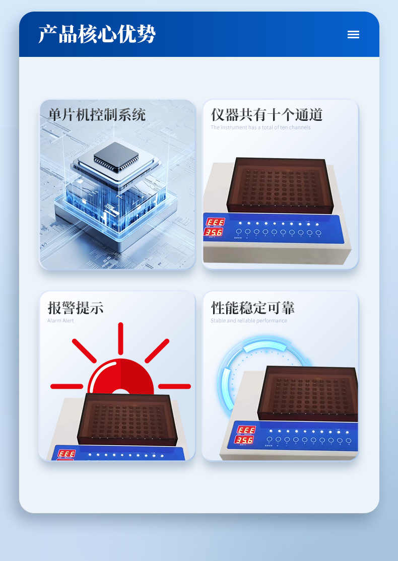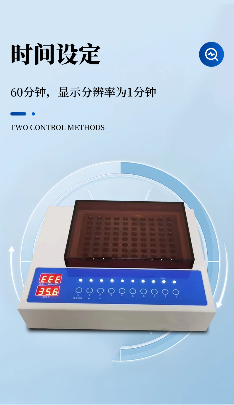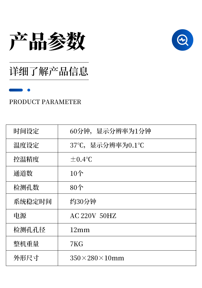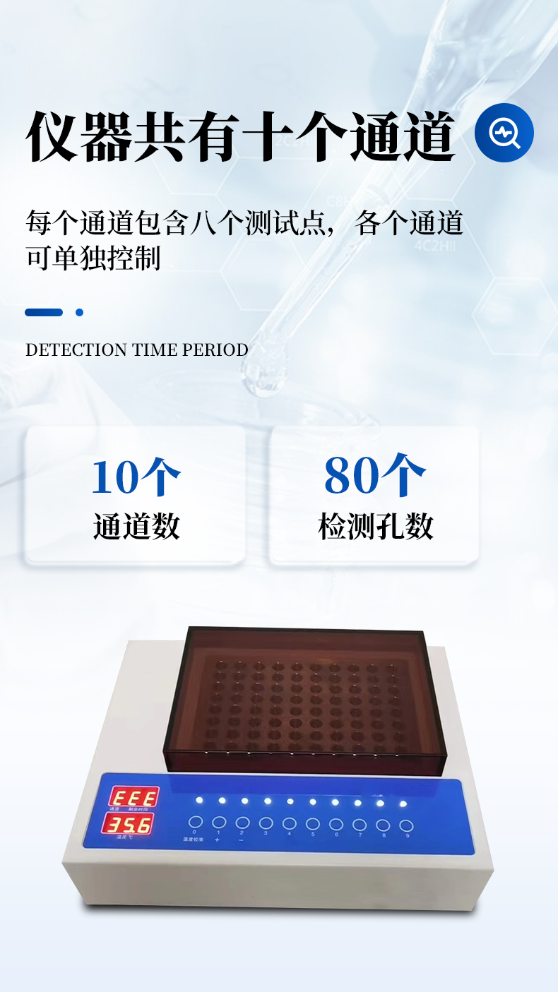 | 1、時(shí)間設(shè)定:60分鐘,顯示分辨率為1分鐘; | 2、溫度設(shè)定:37℃,顯示分辨率為0.1℃; | 3、控溫精度:±0.4℃; | 4、通道數(shù):10個(gè); |