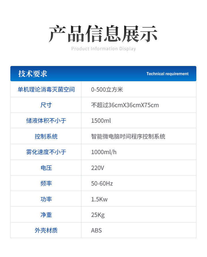 | 1、單機(jī)理論消毒滅菌空間:0-500立方米; | 2、尺寸:不超過36cmX36cmX75cm(長X寬X高,測量誤差±5cm); | 3、儲液體積不小于:1500ml; | 4、設(shè)備底部配有四個滑輪,設(shè)備可以輕松自由推動,方便移動; |