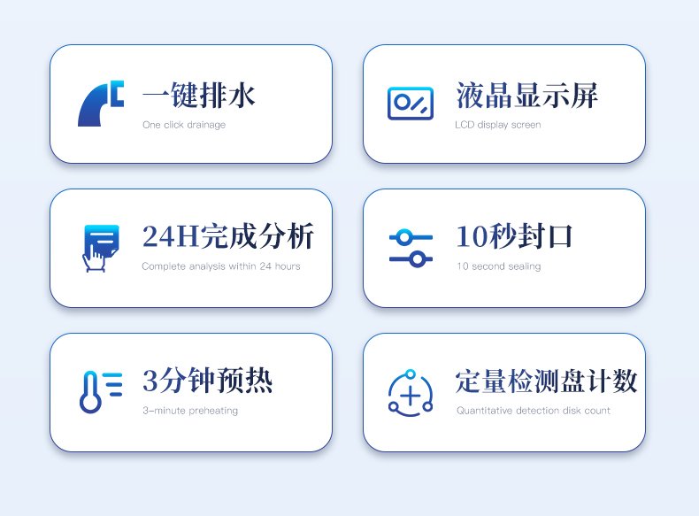 | 5、一鍵排水功能 | 6、大液晶顯示窗口,4個按鍵 | 7、不需要無菌室,24h檢測水中總大腸菌群大腸埃希氏菌耐熱大腸菌群 | 8、預熱時間≤3min |