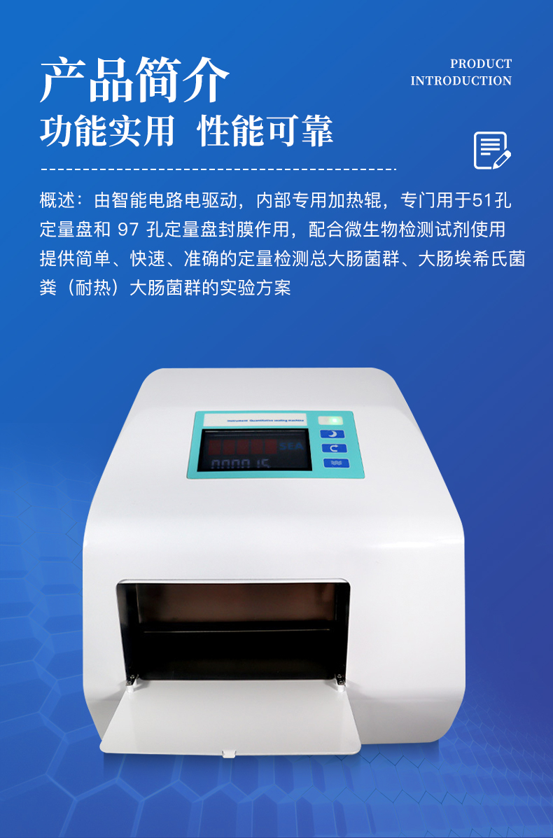 程控定量封口機由智能電路電驅(qū)動,內(nèi)部專用加熱輥,專門用于51孔定量盤和97孔定量盤封膜作用,配合微生物檢測試劑使用,提供簡單、快速、準確的定量檢測總大腸菌群、大腸埃希氏菌、糞(耐熱)大腸菌群、腸球菌和綠膿假單胞菌的實驗方案;51孔定量盤和97孔定量盤是基于傳統(tǒng)方法最大可能數(shù)(MPN)統(tǒng)計模型而設計的半自動定量方法,可定量檢測出水樣結(jié)果,這種方法可以替代并優(yōu)于傳統(tǒng)(濾膜、及多管發(fā)酵)方法檢測水中微生物。