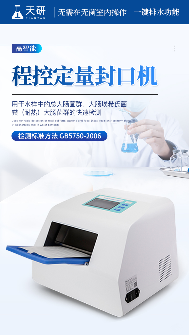 1、無需在無菌室內(nèi)操作。 2、手工操作時間小于 1 分鐘。 3、無需培養(yǎng)基制備和大量玻璃器皿滅菌。 4、24小時即可完成定性定量分析,無需驗證試驗。 5、符合GB5750-2006《生活飲用水標準檢驗方法》固定底物技術酶底物法的MMO-MUG培養(yǎng)基配套使用程控定量封口機,檢測水樣用(51孔定量盤)或(97孔定量盤)封裝。 |
