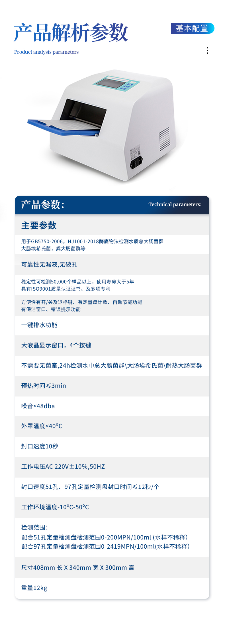 | 13、封口速度:51孔、97孔定量檢測盤封口時間≤12秒/個 | 14、工作環(huán)境溫度-10oC-50oC | 15、檢測范圍:配合51孔定量檢測盤0-200MPN/100ml;配合97孔定量檢測盤0-2419MPN/100ml(水樣不稀釋) | 16、尺寸408mm 長 X 340mm 寬 X 300mm 高 |
