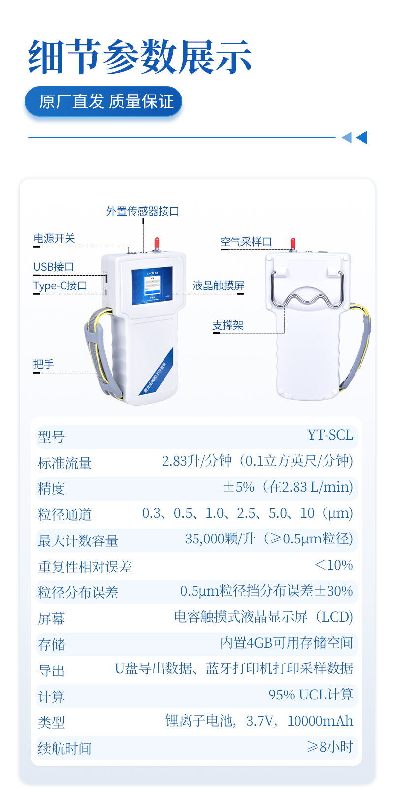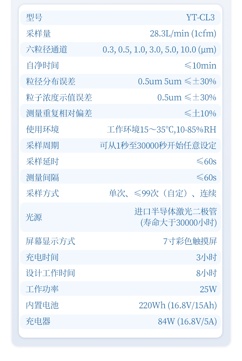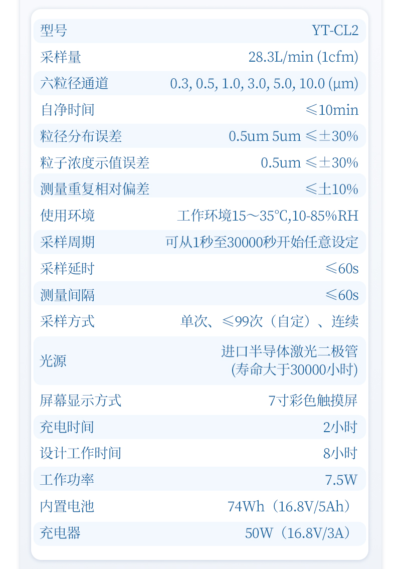 5、數(shù)據(jù)處理 存儲:自動記錄保存采樣數(shù)據(jù),內(nèi)置4GB可用存儲空間 導(dǎo)出:支持U盤導(dǎo)出數(shù)據(jù)、藍(lán)牙打印機(jī)打印采樣數(shù)據(jù) 計算:95% UCL計算,可直接顯示粒子濃度(顆、顆/m3、顆/ft3) |