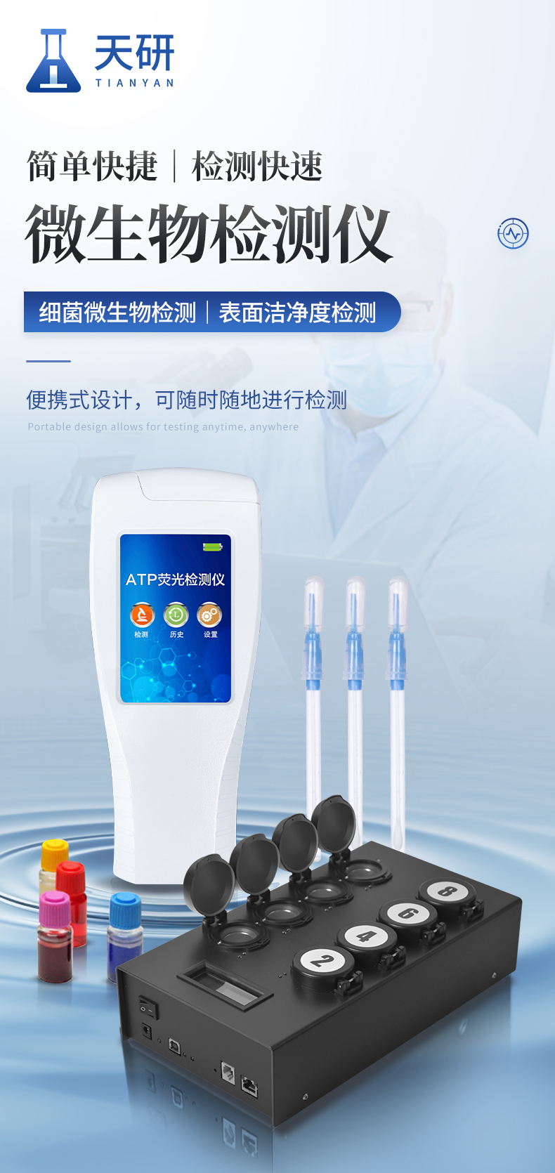 產(chǎn)品簡介:該設(shè)備為全新升級產(chǎn)品,大屏幕觸摸顯示屏,代替?zhèn)鹘y(tǒng)按鍵。操作采用生物化學(xué)反應(yīng)方法檢測ATP含量,ATP熒光檢測儀基于螢火蟲發(fā)光原理,利用“熒光素酶—熒光素體系”快速檢測三磷酸腺苷(ATP)。ATP拭子含有可以裂解細(xì)胞膜的試劑,能將細(xì)胞內(nèi)ATP釋放出來,與試劑中含有的特異性酶發(fā)生反應(yīng),產(chǎn)生光,再用熒光照度計(jì)檢測