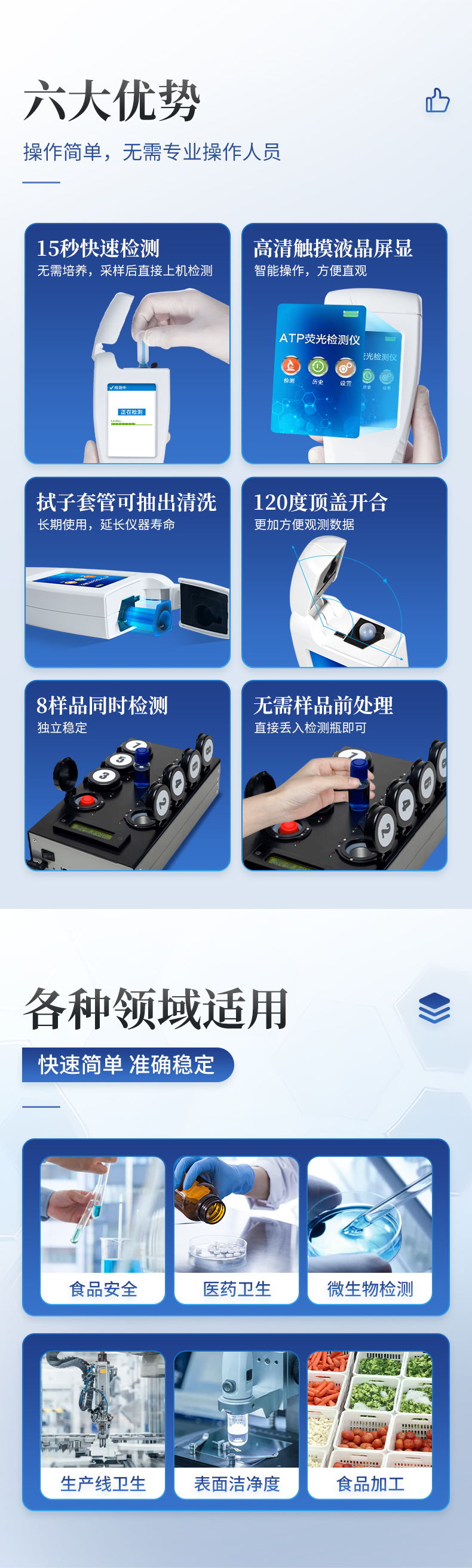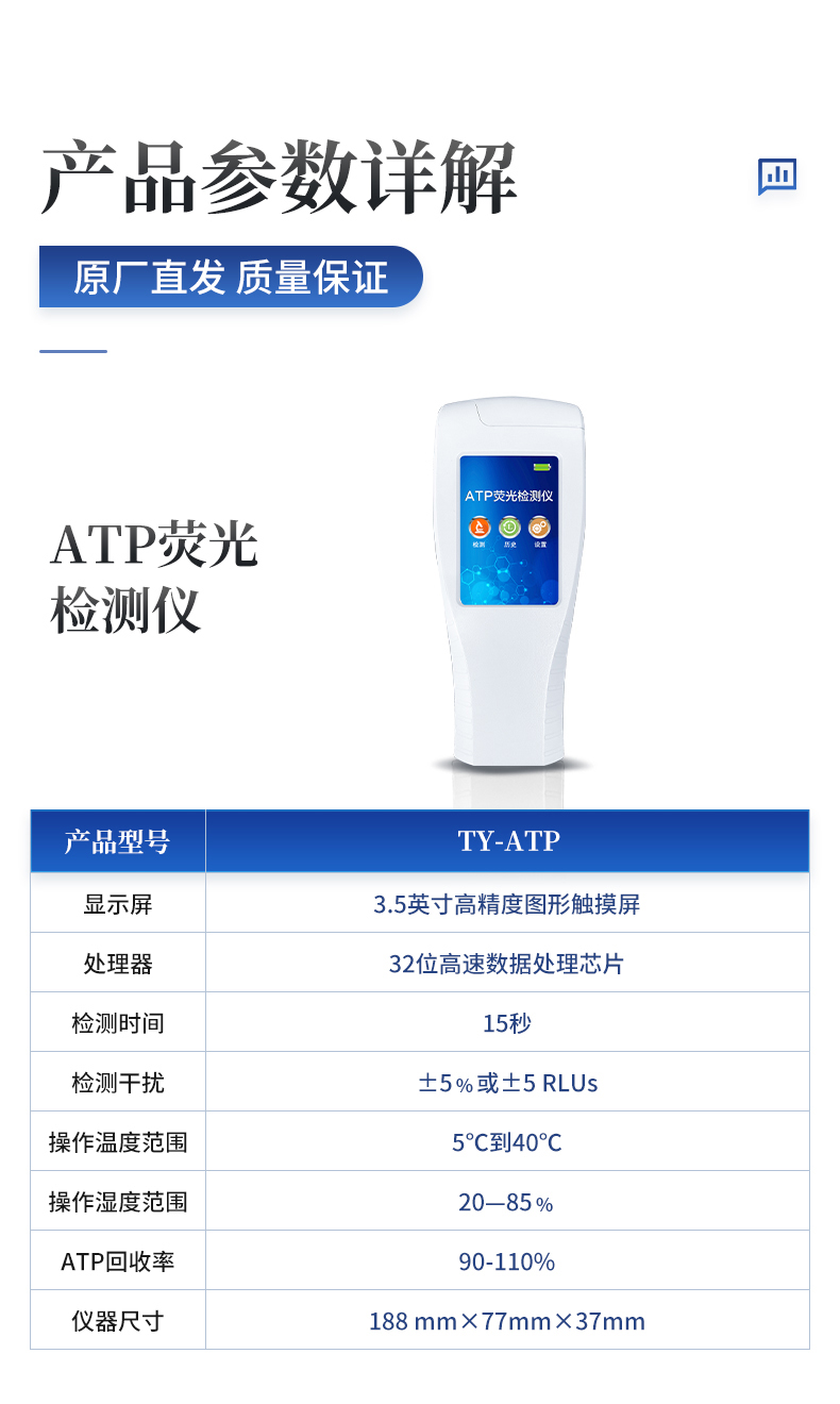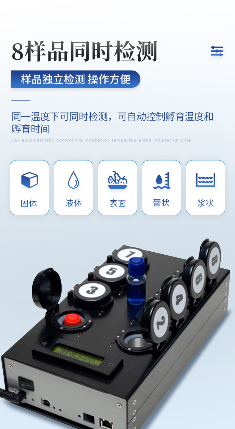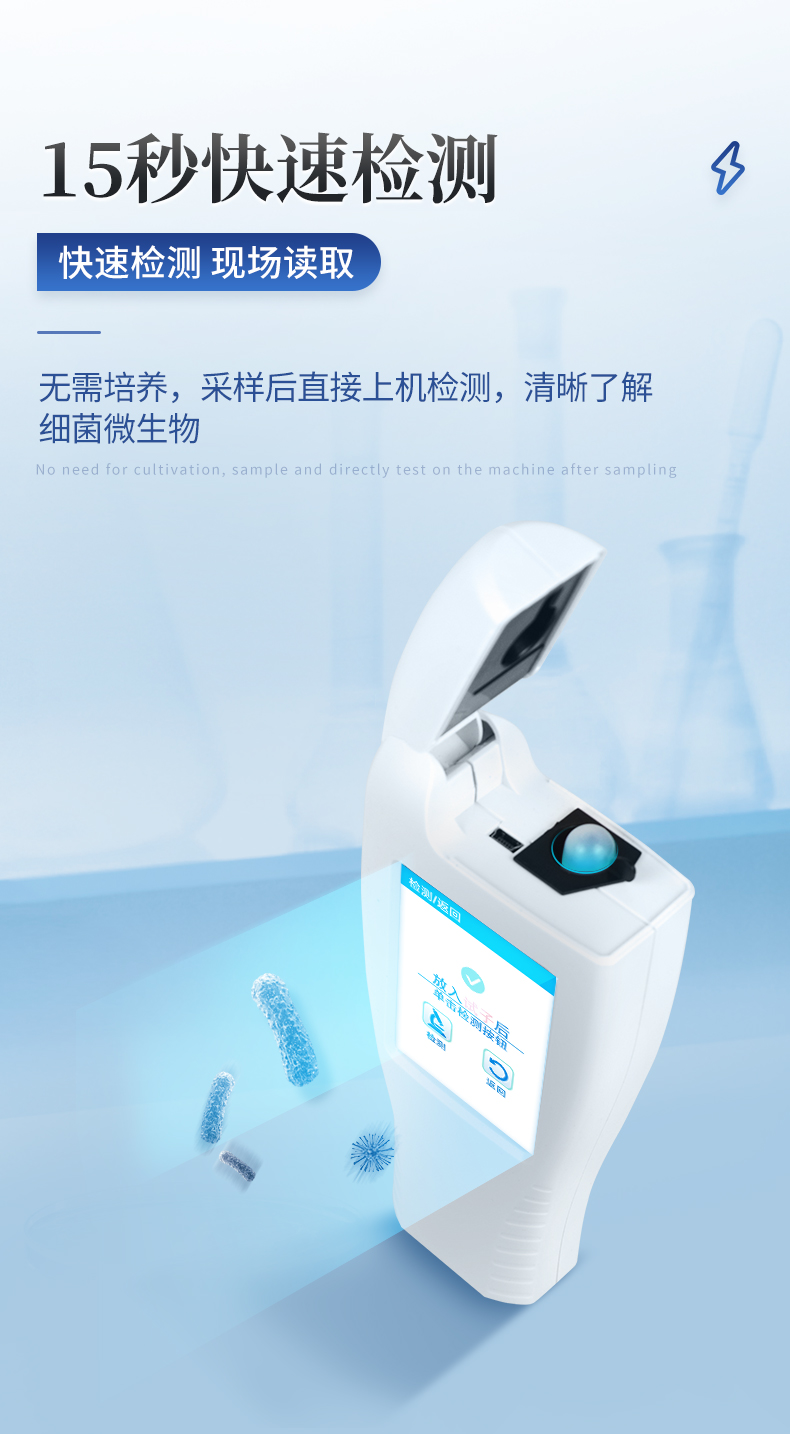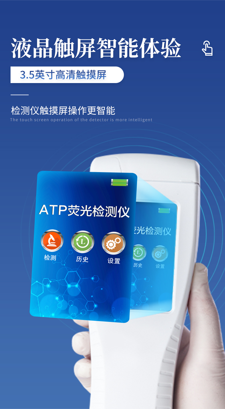 該設(shè)備為全新升級產(chǎn)品,大屏幕觸摸顯示屏,代替?zhèn)鹘y(tǒng)按鍵。操作采用生物化學(xué)反應(yīng)方法檢測ATP含量,ATP熒光檢測儀基于螢火蟲發(fā)光原理,利用“熒光素酶—熒光素體系”快速檢測三磷酸腺苷(ATP)。ATP拭子含有可以裂解細(xì)胞膜的試劑,能將細(xì)胞內(nèi)ATP釋放出來,與試劑中含有的特異性酶發(fā)生反應(yīng),產(chǎn)生光,再用熒光照度計(jì)檢測發(fā)光值,微生物的數(shù)量與發(fā)光值成正比,由于所有生物活細(xì)胞中含有恒量的ATP,所以ATP含量可以清晰地表明樣品中微生物與其他生物殘余的多少,用于判斷衛(wèi)生狀況。