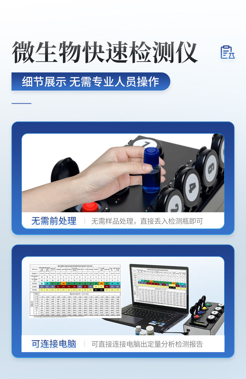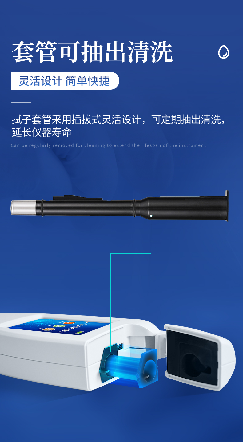 | 實(shí)用性 —— 可根據(jù)環(huán)境檢測需求設(shè)定上下限值,做到數(shù)據(jù)快速評估預(yù)警,表面潔凈度快速篩查。 | 速度快 —— 常規(guī)培養(yǎng)法18-24h以上,而ATP只需要十幾秒鐘 . | 可行性 —— 微生物數(shù)量與微生物體內(nèi)所含ATP有明確的相關(guān)性。 通過檢測ATP含量,可間接得出反應(yīng)中微生物數(shù)量 | 可操作性 —— 傳統(tǒng)培養(yǎng)方法需要在實(shí)驗(yàn)室由經(jīng)過培訓(xùn)的技術(shù)人員進(jìn)行操作;而ATP快速潔凈度檢測操作非常簡便,只需簡單的培訓(xùn)即可由一般工作人員進(jìn)行現(xiàn)場操作。 | 體驗(yàn)更好 —— 試子套管采用插拔式靈活設(shè)計(jì),可定期清洗長期使用,延長儀器壽命。 |
